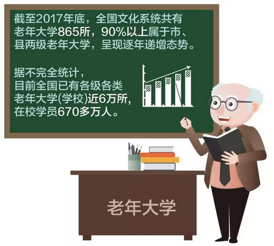 此外,組織、教育、民政等部門也在本系統開展老年(nián)大學(xué)建設工作。據不完全統計,目前全國已有各級各類老年(nián)大學(xué)(學(xué)校)近6萬所,在校學(xué)員670多萬人。