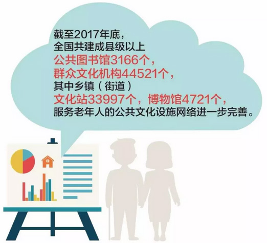 截至2017年(nián)底,全國共建成縣級以上公共圖書館3166個,群衆文化機構44521個,其中鄉鎮(街道(dào))文化站33997個,博物館4721個,服務老年(nián)人的(de)公共文化設施網絡進一(yī)步完善。