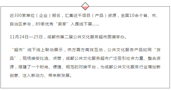 轉載自(zì)@文化在線“超市”升級,彙聚優質公共文化服務資源3年(nián)前,首屆公共文化服務超市共有223家單位、企業、社會團體參加,集中展示交易項目近400個。2018年(nián),第二屆公共文化服務超市在參展單位、交易項目、行業領域等方方面面全面超越首屆。據悉,本屆公共文化服務超市經過“全城熱招”階段,共有來自(zì)北京、廣州等全國各地(dì)的(de)296家企業家單位(企業)報名,彙集産品資源上千個。“超市”重新開張,其中,不乏衆多老……
