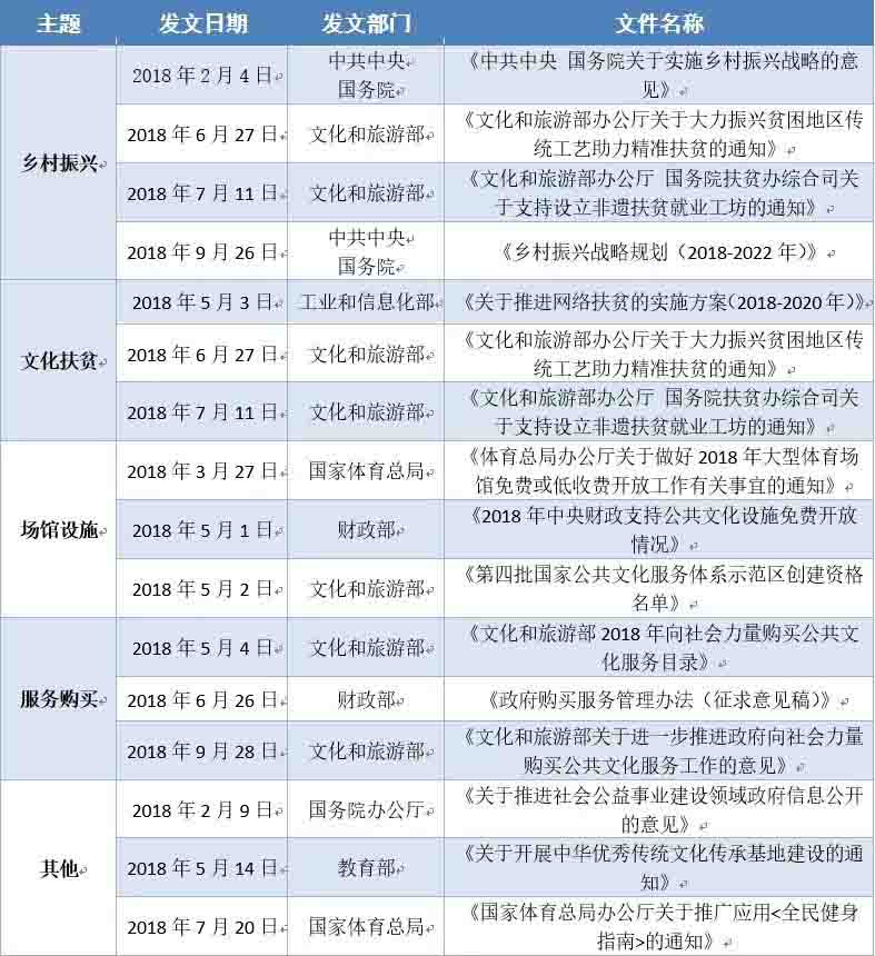 十八大以來,黨中央明确提出到2020年(nián)公共文化服務體系基本建成,現代公共文化服務體系建設步入發展快車道(dào)。2018年(nián)中央在公共文化服務領域密集出台了一(yī)系列政策,政策取向上更加聚焦,與國家重大戰略——鄉村振興戰略配合更加緊密。圍繞鄉村振興戰略,國家出台了一(yī)系列政策法規——《中共中央 國務院關于實施鄉村振興戰略的(de)意見》《鄉村振興戰略規劃(2018-2022年(nián))》等等,都有關于公共文化服務的(de)詳細舉措。其中,在第二十四章(zhāng)“豐富鄉村文化生活”從“健全公共文化服務體系、增加公共文化産品和(hé)服務供給、廣泛開展群衆文化活動”三個小節中詳細規定了鄉村公共文化服務建設的(de)原則和(hé)舉措。2018年(nián)公共文化服務領域出台的(de)政策除了關注鄉村振興外,文化扶貧、場館設施、服務購買等領域也是國家的(de)重點發力方向。