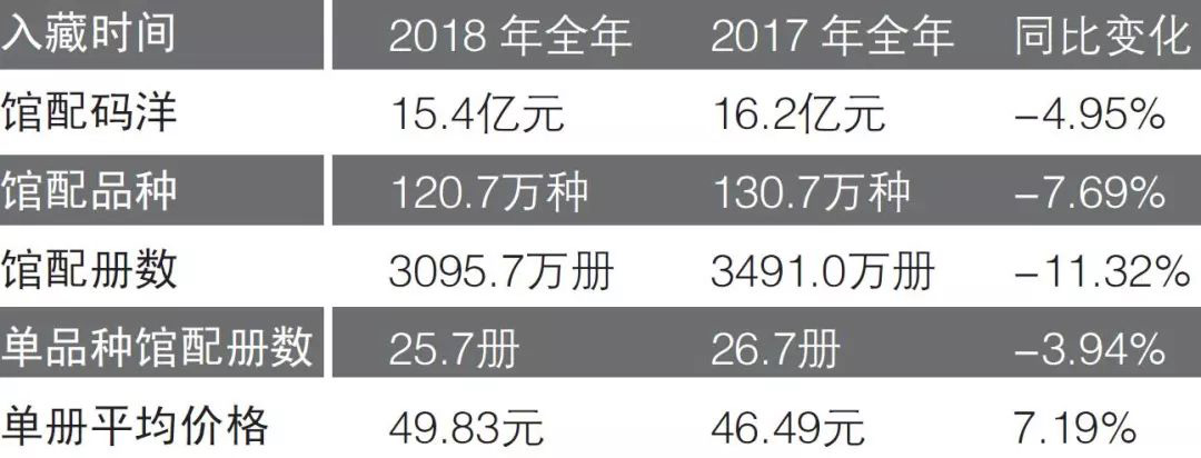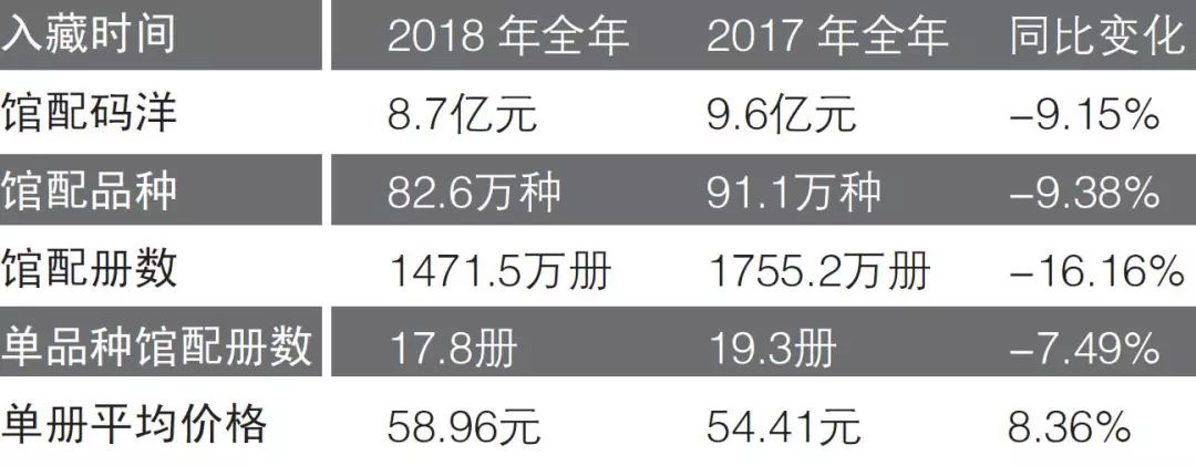 2018年(nián)全年(nián)1250所圖書館中參與館配的(de)中文圖書品種為(wèi)120.7萬種,合計3095.7萬冊,單品種館配冊數為(wèi)25.7冊/種,碼洋累計15.4億元,與2017年(nián)全年(nián)相比,碼洋總額下降4.95%,館配冊數同比下降11.32%,館配品種數同比下降7.69%。2018年(nián)較2017年(nián)除單冊平均價格同比上漲7.19%外,其他館配指标均有不同程度下降,一(yī)方面受數字館藏資源沖擊以及圖書館物理(lǐ)空間規劃的(de)影響,紙質圖書入藏量依然呈下降趨勢;另一(yī)方面受“第六次全國縣級以上公共圖書館評估定級”工作影響,2017年(nián)公共館集中擴大采購規模,從而拉動整體館配市場體量,當2018年(nián)回歸到之前的(de)館藏力度時,館配品種和(hé)冊數的(de)下降成為(wèi)必然。