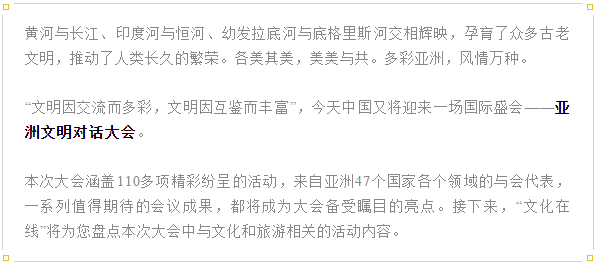 據了解,大會框架下的(de)文化旅遊與人民交往平行分論壇彙集亞洲多國政要,共商亞洲文明交流發展大計,亞洲文明周活動則通過亞洲文明巡遊、亞洲文化展演、亞洲文化旅遊展、亞洲文明聯展等活動充分展示亞洲文明的(de)多姿多彩。