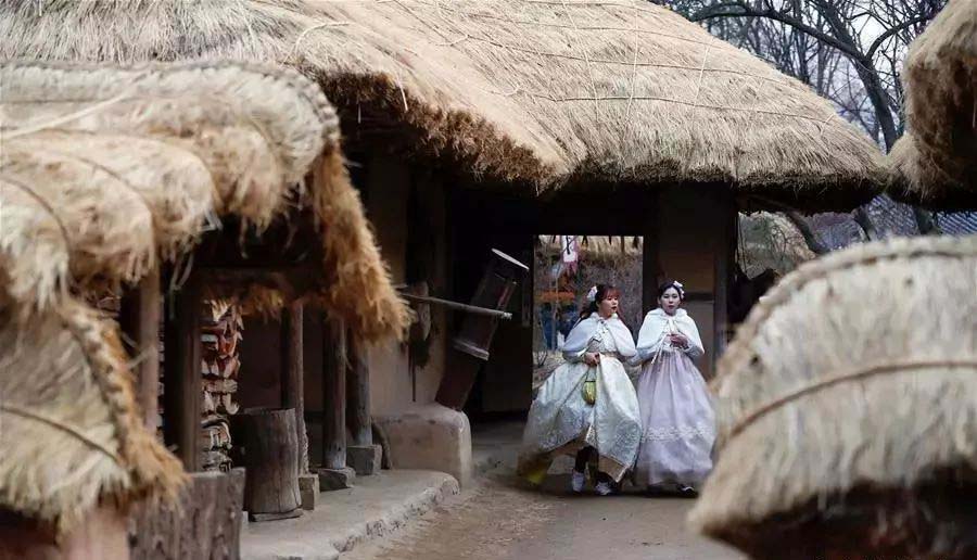 身着韓服的(de)遊客在韓國龍仁市民俗村遊覽(圖據新華社)