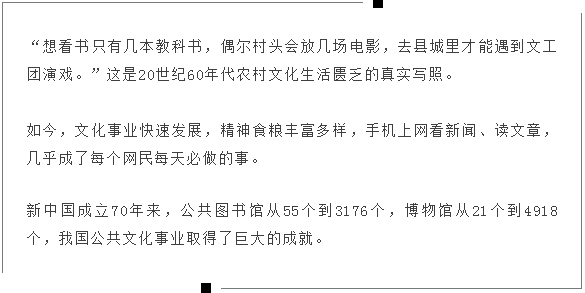 精美的(de)圖書、精彩的(de)展覽、精緻的(de)文創産品越來越多,各種類型的(de)網絡文藝也蓬勃興起……人們的(de)文化生活可(kě)謂多姿多彩。