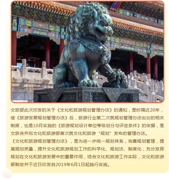 為(wèi)進一(yī)步統一(yī)規劃體系,完善規劃管理(lǐ),提高(gāo)規劃質量,不斷提升文化和(hé)旅遊規劃工作的(de)科學(xué)化、規範化、制度化水平,我部制定了《文化和(hé)旅遊規劃管理(lǐ)辦法》,現予印發,請認真遵照執行。