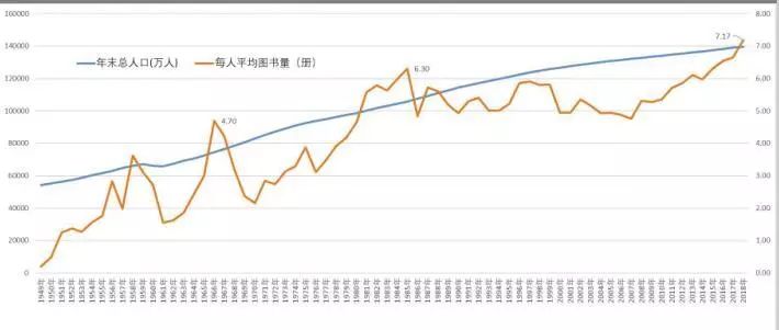 圖7 1949—2018年(nián)我國年(nián)末總人口數量、年(nián)度人均圖書量走勢