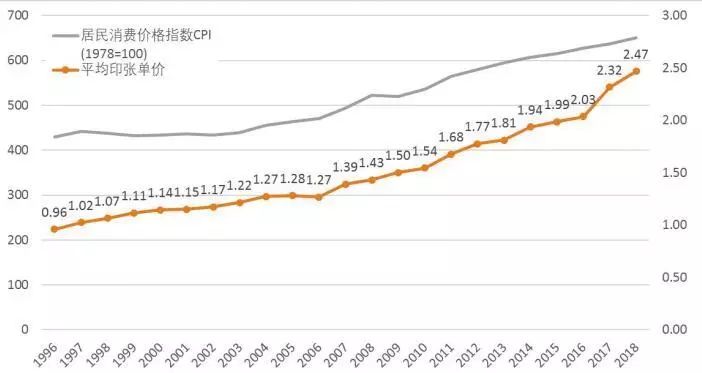 圖8 1996—2018年(nián)居民消費價格指數CPI、年(nián)度平均印張單價走勢