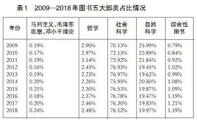 統計顯示,從1950年(nián)到2018年(nián),在出版整體規模持續擴大的(de)基礎上,各年(nián)五大部類品種占比基本穩定中呈現出不同增減趨勢。社會科學(xué)類圖書品種占比最大,并有小幅度提升;綜合類圖書占比最小,且在明顯增加。自(zì)然科學(xué)類圖書占比呈現下降趨勢,占比從2009年(nián)的(de)25.99%下降到2018年(nián)的(de)19.97%。(見表1)