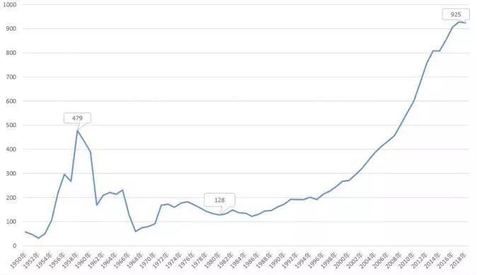 随着出版機構改革調整、出版轉企改制的(de)推進,出版單位的(de)出版能力逐步提升、不斷加強,圖書出版量總量加大,年(nián)均出版量持續提高(gāo)。1950年(nián),出版單位年(nián)平均出書約58種;改革開放剛剛開始時,出版單位年(nián)均出版圖書128種,到2018年(nián)出版單位年(nián)均出版圖書925種,出書量比新中國成立初期增長(cháng)了近15倍,比改革開放初期增長(cháng)了6.22倍。年(nián)均出版量的(de)提升也說明了出版單位綜合出版能力不斷加強。(見圖5)