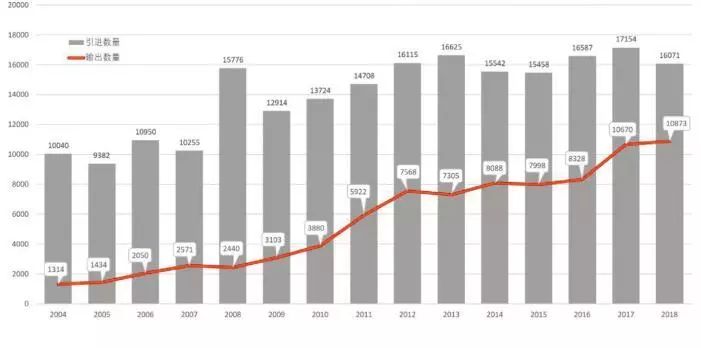 從版權引進來看,2004年(nián)為(wèi)10040項,2018年(nián)達到16071項,增長(cháng)60%,平均年(nián)增長(cháng)速度為(wèi)3%。從版權輸出看,2004年(nián)為(wèi)1314項,2018年(nián)為(wèi)10873項,增長(cháng)727%,平均年(nián)增長(cháng)速度為(wèi)15%,增長(cháng)非常迅速。特别是黨的(de)十八大以來,圖書版權引進數量與版權輸出數量比例變化明顯,2012為(wèi)2.12:1,到2018年(nián),這一(yī)比例已經縮小為(wèi)1.47:1,從側面反映了中國文化在世界傳播體系中話語權的(de)提升和(hé)在國際舞台的(de)影響力正在與日俱增。(見圖9)