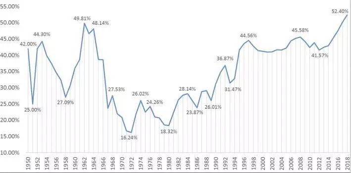 1950—2018年(nián),我國圖書重印再版率起伏波動。1950—1958年(nián)期間,新中國成立後,大量新書出版,圖書重印率直線下降;1958—1966年(nián),國家起步基礎教育教材建設,大量課本的(de)重印提升了重印再版率,1962年(nián)的(de)重印再版率達到49.81%;改革開放後,圖書重印再版率不斷上升,特别是90年(nián)代,受教輔市場影響,圖書重印再版率增速明顯;2000年(nián)後,受新一(yī)輪義務教育課程教材改革、出版社仍保持“數量增長(cháng)型”模式的(de)影響,重印再版率略有小幅下滑;但從2012年(nián)開始,圖書消費市場進一(yī)步增長(cháng),出版逐步由數量擴展向質量提升轉型,國家一(yī)系列資助精品出版工程推進,重印再版率持續提升,2018年(nián)達到52.40%,為(wèi)新中國成立以來的(de)最高(gāo)點,既反映了我國出版業經過70年(nián)發展,出版了一(yī)大批經久不衰的(de)傳世之作,也反映了當前出版産業經過調整優化後正在形成的(de)持續穩健發展的(de)強勁态勢。(見圖3)
