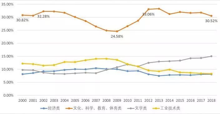 從22個大類中選取出版品種最多的(de)四大類來看。近20年(nián)來,文學(xué)類圖書占比保持持續上升,從2000年(nián)的(de)9.75%上升到2018年(nián)的(de)15.01%,成為(wèi)最穩定的(de)闆塊。文教類(文化、科學(xué)、教育、體育類)圖書是出版領域的(de)核心闆塊,特别是改革開放後随着基本教育的(de)普及、高(gāo)等教育的(de)擴張、職業教育的(de)大力發展,文教類圖書迎來了最好的(de)發展期,近年(nián)來品種占比盡管波動明顯,2000年(nián)為(wèi)30.82%,2009年(nián)下降到24.58%,2011年(nián)回升至33.06%,近幾年(nián)又維持在30%以上,但一(yī)直維持整體品種的(de)1/3左右。經濟類、工業技術類品種在基本穩定的(de)趨勢下占比略有下降,但同樣是重要的(de)核心闆塊,為(wèi)新世紀以來經濟發展、技術進步發揮了重要的(de)、不可(kě)替代的(de)作用。(見圖6)