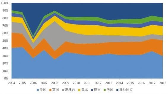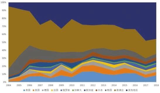 圖10 2004—2018年(nián)我國圖書版權引進國家和(hé)地(dì)區占比情況