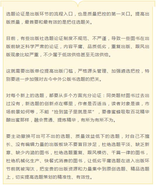 當前我國圖書出版供給不是缺不缺、夠不夠的(de)問題,而是好不好、精不精的(de)問題。現在年(nián)出版圖書約50萬種,真正有價值、叫好又暢銷的(de)精品還不是很多,有不少是可(kě)出可(kě)不出的(de)。