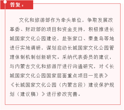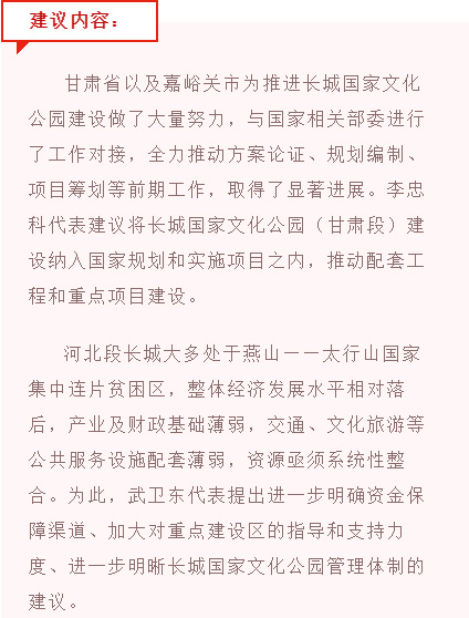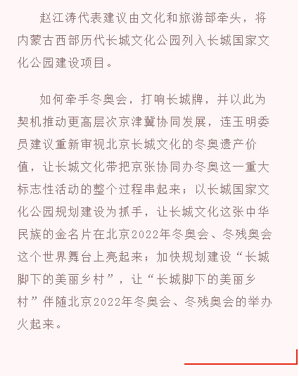 李忠科、武衛東、趙江濤等代表及連玉明等委員《加強古長(cháng)城保護和(hé)推進長(cháng)城國家文化公園建設》《關于牽手冬奧會,打響長(cháng)城牌,加快規劃建設長(cháng)城腳下的(de)美麗鄉村的(de)提案》