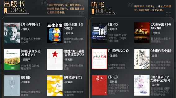 此前,在“風帆好書榜”結合用戶喜好、作品熱度、閱讀時長(cháng)等數據推薦的(de)“2021年(nián)度出版書”中,主旋律現實題材作品表現亮(liàng)眼,《鄧小平時代》《重生:湘江戰役失散紅(hóng)軍記憶》等10部出版作品上榜;《鐵骨铮铮》《守望初心》《沉默之覺醒》等10部作品進入2021年(nián)度原創現實題材推薦榜單;“2021年(nián)度聽書”推薦中,《長(cháng)征》《中國經濟2021》《三體》等10部精品有聲書上榜。
