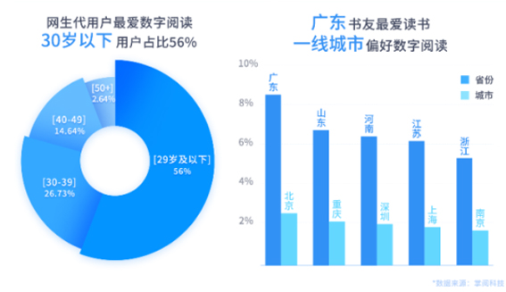 從用戶構成上看,30歲以下的(de)網生代用戶是數字閱讀的(de)主力軍,占比達56%。從用戶分布上看,廣東、山東、河南、江蘇、浙江等省的(de)用戶數居前列,北京、重慶、深圳、上海、南京等城市的(de)讀者對數字閱讀接受程度排名靠前。從內(nèi)容類型偏好上看,54.56%的(de)用戶偏愛網絡文學(xué)。