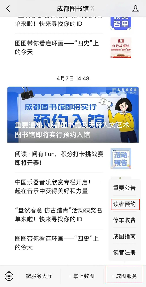 讀者通過點擊微信公衆号“成都圖書館”底部子(zǐ)菜單“成圖服務”—“讀者預約”實名預約一(yī)周內(nèi)入館名額。