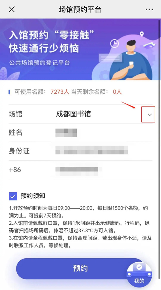 進入實名預約界面,讀者選擇場館、提供姓名、居民身份證号碼、電話号碼進行入館預約界面。預約成功後,系統将提示結果。