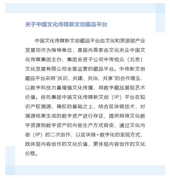 為(wèi)進一(yī)步發揮文化央企帶頭作用,推動文旅元宇宙及Web3.0相關産業良性發展,不斷深化文旅元宇宙産業交流,打開線上線下一(yī)體化的(de)數字化文化體驗全新維度,中傳悅衆(北京)文化發展有限公司将可(kě)通過書面授權的(de)方式開放中國文化傳媒新文創藏品平台、中國文化傳媒新文創(IP)平台、中國文化傳媒新文創線下數字空間體驗館名稱、描述、品牌、商标等相關标識的(de)使用權限。